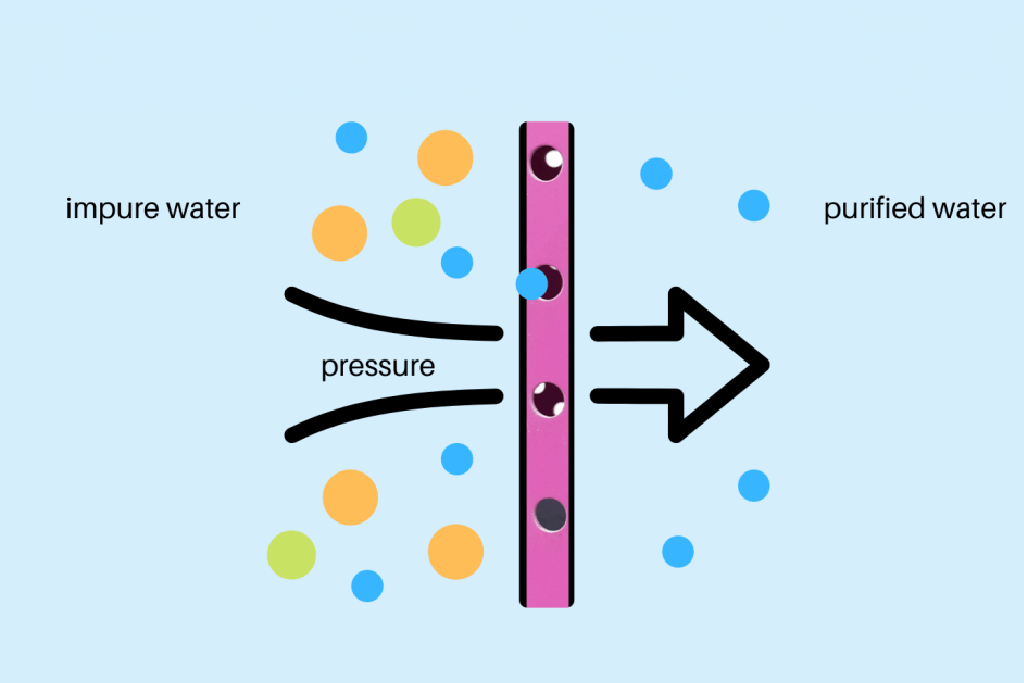 W osmosis odwrotnej woda jest przepuszczana przez różne filtry. Cząsteczki wody mogą przechodzić przez małe pory różnych filtrów, podczas gdy większe cząsteczki są filtrowane.