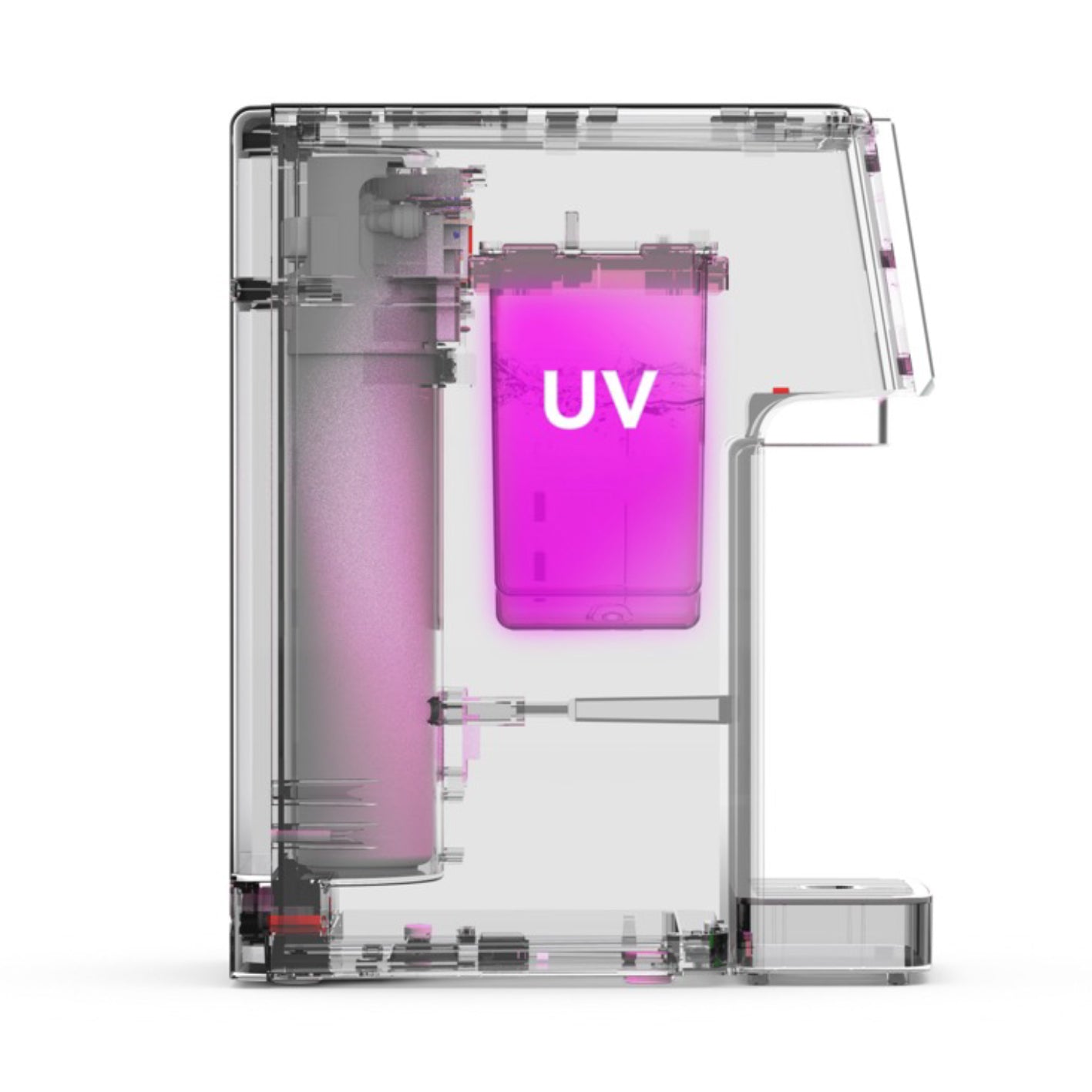 Sterylizator UV-C zapewnia ostatnią warstwę ochrony, wykorzystując światło ultrafioletowe do niszczenia do 99,9% bakterii i wirusów. Proces ten, pozbawiony chemikaliów, gwarantuje ciągłą dezynfekcję, zapewniając wodę nie tylko czystą, ale i bezpieczną do picia. Wbudowany w system, sterylizator UV-C działa cicho i wydajnie, zapewniając spokój przy każdym łyku.